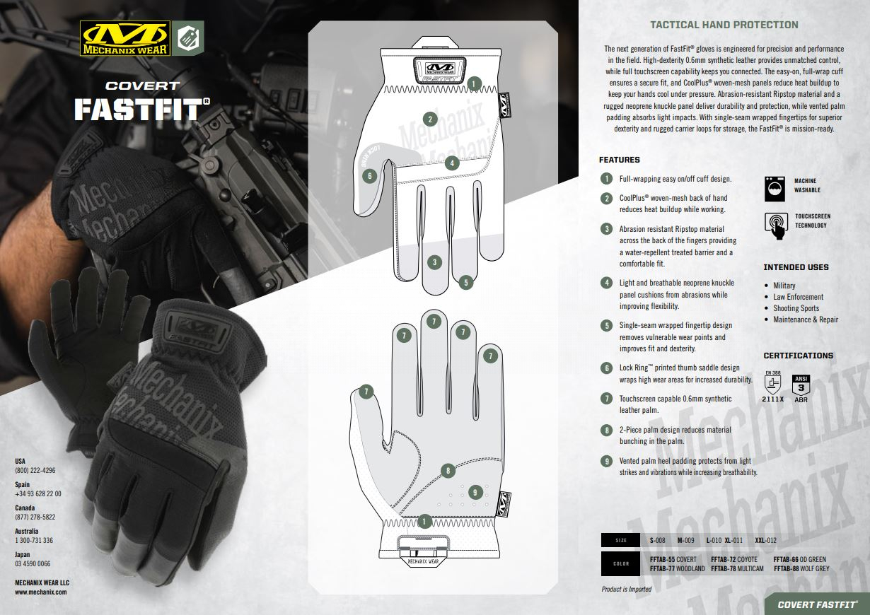 Перчатки FastFit® нового поколения разработаны для точности и производительности в полевых условиях. Высококачественная синтетическая кожа толщиной 0.6 мм обеспечивает непревзойденный контроль, а возможность использования сенсорного экрана позволяет оставаться на связи. Легко надеваемая манжета с полным облегающим кроем гарантирует надежную фиксацию, а сетчатые вставки CoolPlus® уменьшают накопление тепла, сохраняя руки в прохладе даже в стрессовых ситуациях. Износостойкий материал Ripstop и прочная неопреновая панель на костяшках пальцев обеспечивают долговечность и защиту, а вентилируемая подкладка на ладони поглощает легкие удары. Благодаря облегающим кончикам пальцев с одним швом для превосходной ловкости и прочным петлям для хранения, FastFit® готов к выполнению любых задач.
